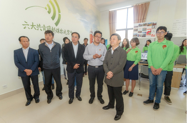 在云南大学共青团新媒体运营中心,傅振邦听取了云南大学团委书记于春滨对中心工作理念、运作机制、特色项目的介绍,详细了解了“三微一网”和“青年之声”平台的运行情况。他希望团组织要运用互联网思维,加强“网上共青团”建设,推动团学工作网络化、扁平化、项目化运行。