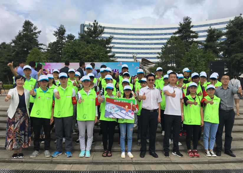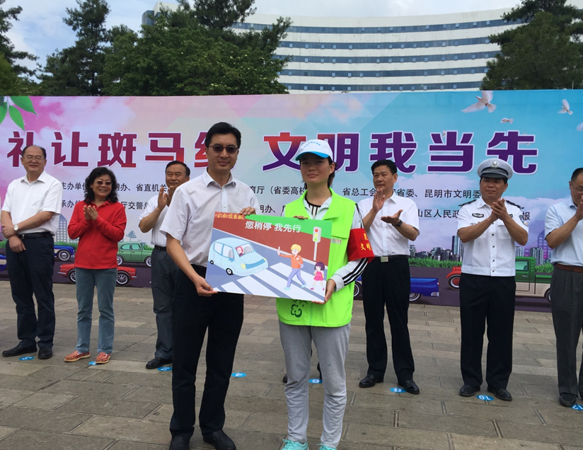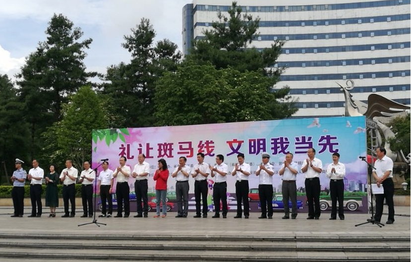 为进一步助力昆明市全国文明城市创建工作,6月24上午10点,省直机关省级以上文明单位、昆明市相关单位、西山区有关部门以及学生、出租车司机、公交车司机、驾校人员、网约车司机以及青年志愿者约600人,在碧鸡广场举行"礼让斑马线 文明我当先"倡议活动启动仪式。