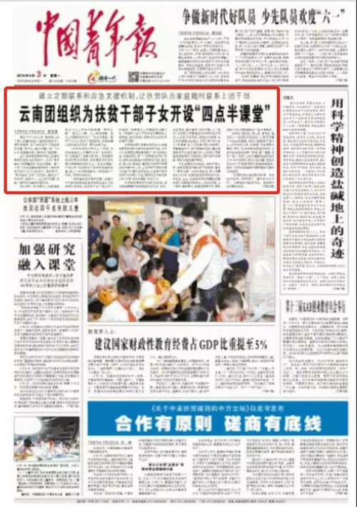 今年3月,共青团云南省委发起了“助力脱贫攻坚 关爱扶贫队员——共青团在行动”活动,要求各级团组织在昆明五华区、盘龙区、西山区、官渡区、呈贡区内扶贫干部居住较为集中的小区,以及扶贫干部较为集中的省(市)直机关所在地,以扶贫干部未成年子女和老人为主,兼顾社区内其他青少年,开展“四点半课堂”试点工作。