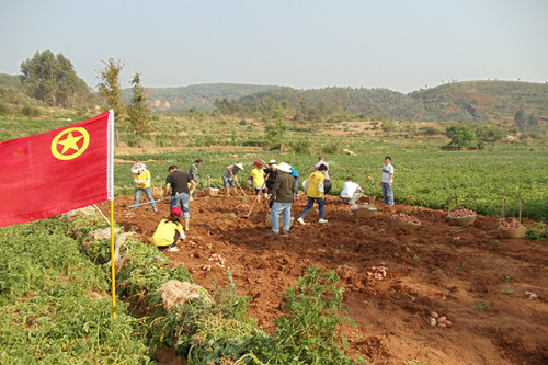 22日下午,尽管天气十分炎热,然而青年志愿者和青年团员们顶着炎炎烈日,热火潮天地帮助群众抢挖马铃薯。在铁所坝子河马铃薯示范种植基地,飘扬着共青团的旗子、跃动着志愿者的身影,领导和志愿者们发扬不怕苦、不怕累、不怕流汗的精神,与群众打成一片,一个个奋勇争先、不甘落后,挖的挖、捡的捡,两个小时的劳动让他们一个个累得满头大汗,让马铃薯种植户十分感动。