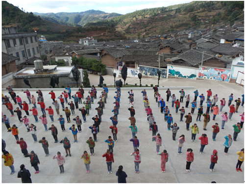 到武定参与培训的体育老师们,利用体育课、课余时间,顶着烈日的曝晒,一个动作一个动作,手把手的教,大一点反应快的孩子,两个星期基本掌握了全部动作,小一点的孩子三个星期后,也基本跟得上节奏。通过近一个月的学习教育,我校从根本上掌握了这套操。我校师生十分喜欢这套操,有的班级把这次活动中的一些内容融入到其他文化课,并取得一定效益。有的孩子在课余时间也在比划嘻戏。校园里充满这欢声笑语、青春活力。