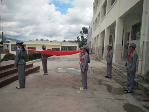 在2017学年秋季学期开学的第一天,武定县插甸镇革命英烈红军小学全体师生以饱满的精神状态齐聚在操场上,举行新学期第一次升旗仪式,伴随着雄壮的国歌声,五星红旗冉冉升起,师生精神饱满面向红旗行礼。简短而隆重的升旗仪式之后,学生代表作了国旗下讲话,希望全校师生在新学期里用自己的勤奋与智慧翻开新的画卷、书写新的篇章!同时借助国旗下讲话的机会值周教师以“新学期新面貌”为主题给在场的师生们上好了新学期第一课,为师生们打足了气,为本学期学校的教育教学工作打下坚实的基础。