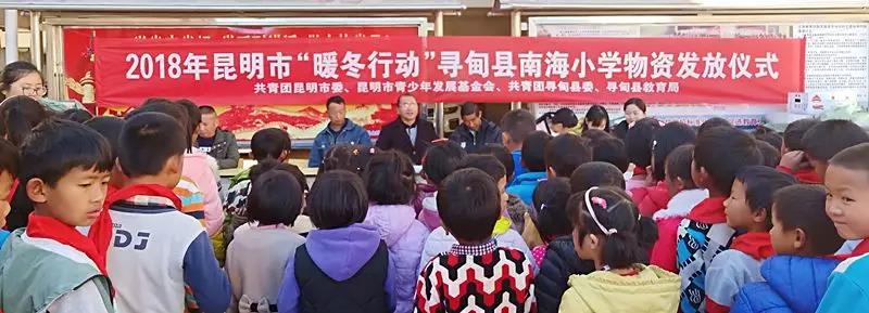 天气渐寒,温情不减。2018年12月11日,共青团昆明市委、昆明市青少年发展基金会、共青团寻甸县委、寻甸县教育局在鸡街镇南海小学举行2018年昆明市“暖冬行动”寻甸县南海小学物资发放仪式,为孩子们送去温暖的冬衣和满满的祝福,南海小学150名学生领到了这份暖暖的关爱。