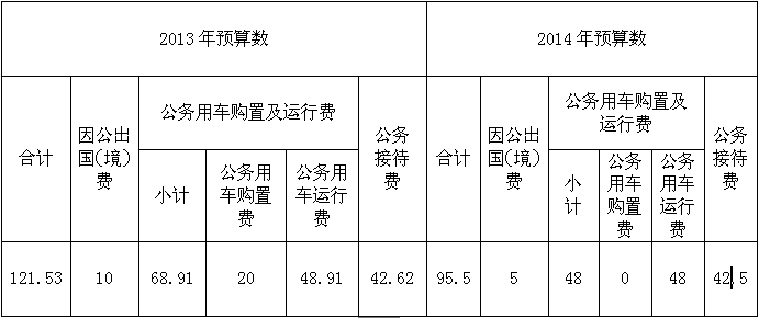 2014年“三公”经费预算数比2013年预算数减少26.03万元,减少的主要原因是:压缩因公出国(境)费用和公务用车购置零费用。具体情况如下:
